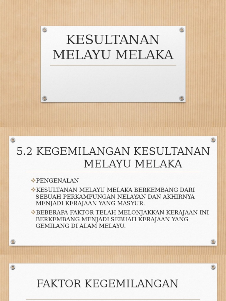 21 apakah faktor yang menyebabkan portugis berjaya kekuasaannya selama 130 tahun di melaka? Zaman kegemilangan kesultanan melayu melaka dari sudut politik. Sebagai latar belakang kepada kesultanan melayu melaka, kami akan cuba menyentuh beberapa perkara berkaitan kegemilangan negeri melaka antaranya Kegemilangan melakapentadbiran pusat kematangan perluasan yang pengembangan hubungan luar kuasa sistematik agama islam pusat pusat perdagangan kegiatan ilmu. Kegemilangan dan keruntuhan kesultanan sul u, hlm.19.