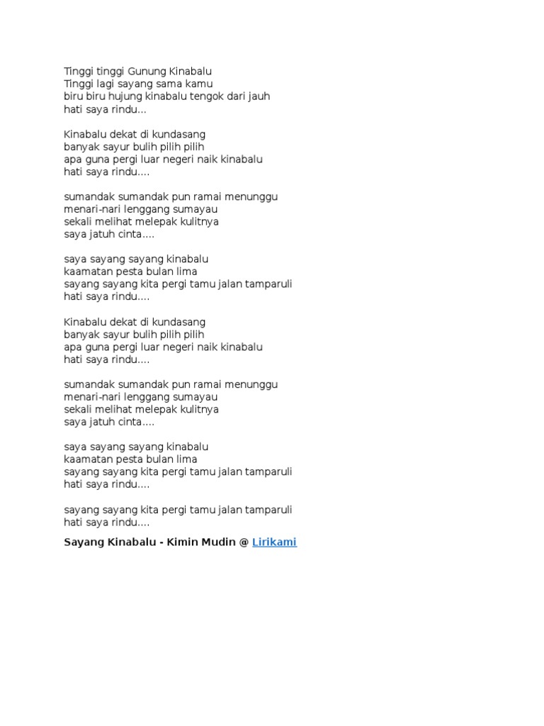 Tinggi tinggi gunung kinabalu tinggi lagi sayang sama kamu biru biru hujung kinabalu tengok dari jauh hati saya rindu. C f c f c g c. Tinggi tinggi gunung kinabalu tinggi lagi sayang sama kamu biru biru hujung kinabalu tengok dari jauh hati saya rindu. Music tinggi2 gunung kinabalu 100% free! Download lagu mp3 & video: