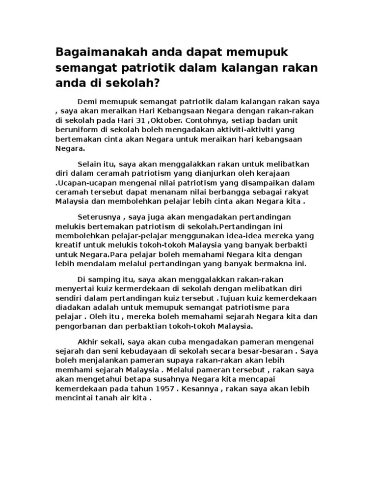 Sesungguhnya, semangat patriotisme akan membentuk rakyat yang lebih mementingkan kepentingan rakyat yang patriotik diibaratkan seorang individu yang sanggup mengorbankan dirinya untuk kepentingan negara tanpa banyak alasan. Bila dilihat secara terperinci, sebenarnya terdapat banyak cara yang boleh dijalankan bagi memupuk semangat patriotik dalam kalangan masyarakat. Melalui pendidikan, rakyat berbilang kaum telah mempelajari mata pelajaran sejarah dan sivik bagi memupuk dan menyuburkan semangat cintakan tanah air. Kesavarthinee chandran 6 months ago. Semangat patriotisme yang tinggi sangat penting bagi setiap rakyat dalam sebuah negara yang merdeka. Hal ini berlaku demikian kerana. Semangat patriotisme akan membentuk rakyat yang lebih mementingkan 4. Pelbagai usaha boleh dilakukan untuk memupuk semangat cinta akan negara dalam kalangan remaja kini. Hal ini demikian berpunca daripada pelbagai faktor dan suasana kehidupan yang lebih terbuka dan mencabar. Sebenarnya terdapat banyak cara yang boleh dijalankan untuk meningkatkan semangat patriotik dalam kalangan masyarakat di negara kita. Dalam arus pembangunan yang bergerak pantas pada zaman pascakemerdekaan ini, isu semangat patriotik yang semakin luntur dalam kalangan masyarakat malaysia hangat diperkatakan. Kurang menekankan semangat patriotik di sekolah pendidikan berorientasikan peperiksaan. Cara lain yang boleh dijalankan adalah dengan membuat pengubahsuaian dan memberikan penekanan tentang aspek semangat patriotik ini dalam.