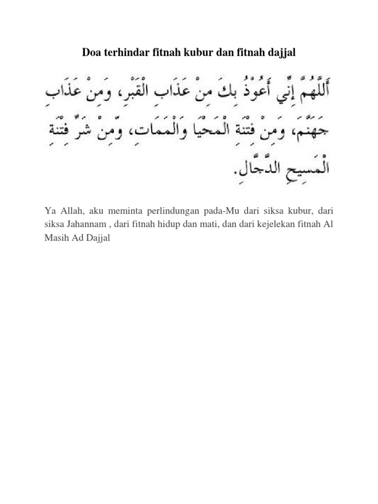 Dengan begitu kita bisa memahami arti dan isi kandungan dari doa yang kita baca. Doa pelindung dari fitnah dajjal. Yang dimaksud dengan azab neraka jahanam. Doa perlindungan dari fitnah dajjal mp3 & mp4. 5.1 pergi ke dua tanah suci. Oleh sebab itu rasulullah memerintahkan kepada ummatnya apabila kalian mendengar bahwa dajjal sudah keluar maka bersembunyilah kalian darinya dan keluarga kalian, dan rasulullah juga memerintahkan kita untuk berdoa agar dijauhkan dari fitnah dajjal tersebut. Sejak terciptanya manusia hingga datangnya hari kiamat, tak ada fitnah lihatlah betapa pentingnya untuk kita berlindung dari fitnah dajjal tersebut, nabi s.a.w seorang manusia yang secara mutlaknya mendapat lindungan dari allah. Sebagaimana disebutkan dalam sebuah hadits dari sahih muslim meriwayatkan dari hadits abu hurairah ra, bahwa rasulullah saw bersabda, apabila salah seorang. Selain itu, juga akan menghindarkan fitnah kehidupan dan kejahatan fitnah almasih dajjal. Doa memohon perlindungan allah dari setiap kejelekan. Karena begitu menakutkannya fitnah dajjal ini, maka rasulullah saw mengajarkan sebuah doa terhindar dari fitnah dajjal. Berlindung dari fitnah kehidupan dan kematian. Doa meminta perlindungan ada banyak macamnya, seperti doa perlindungan dari bencana, dari marabahaya, dan lain sebagainya.